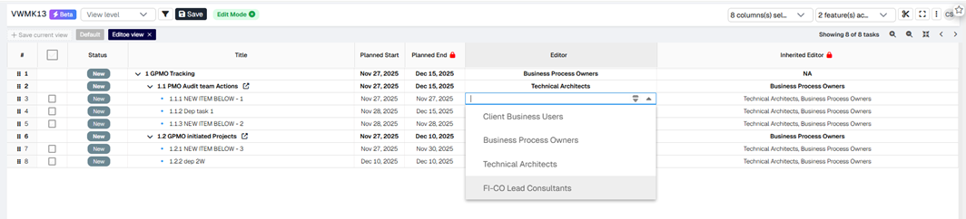 If a parent task has an Editor Group assigned, all child tasks automatically inherit that authorization. When a different group is explicitly assigned at the child level as the Editor, the child task holds both its own assigned Editor Group and the inherited group from the parent — and this combined inheritance continues to propagate down to all further descendant tasks.