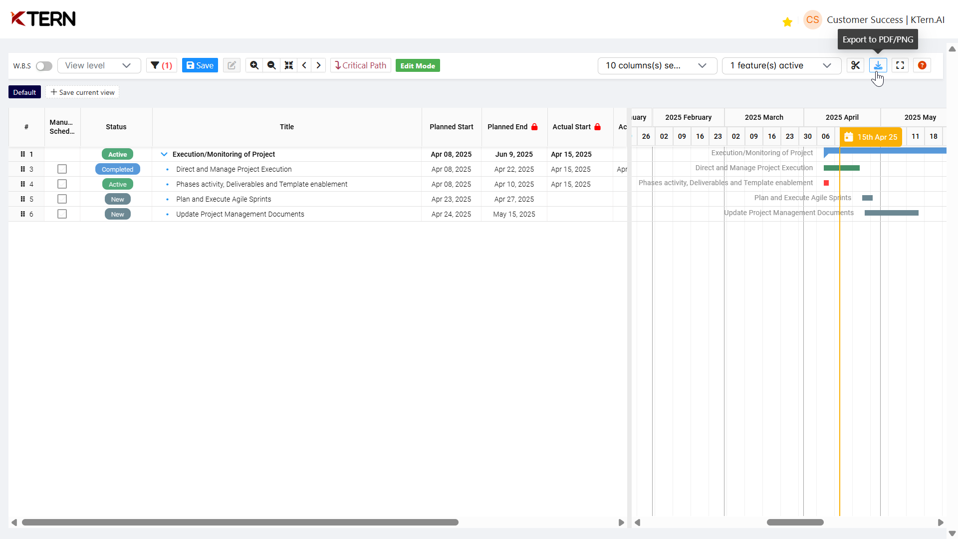 KTern's Project Planner offers a Gantt-style layout designed for efficient planning, tracking, and exporting filtered work items. This guide provides step-by-step instructions to access the planner and export tailored views for status updates and reviews.