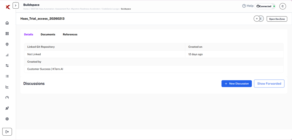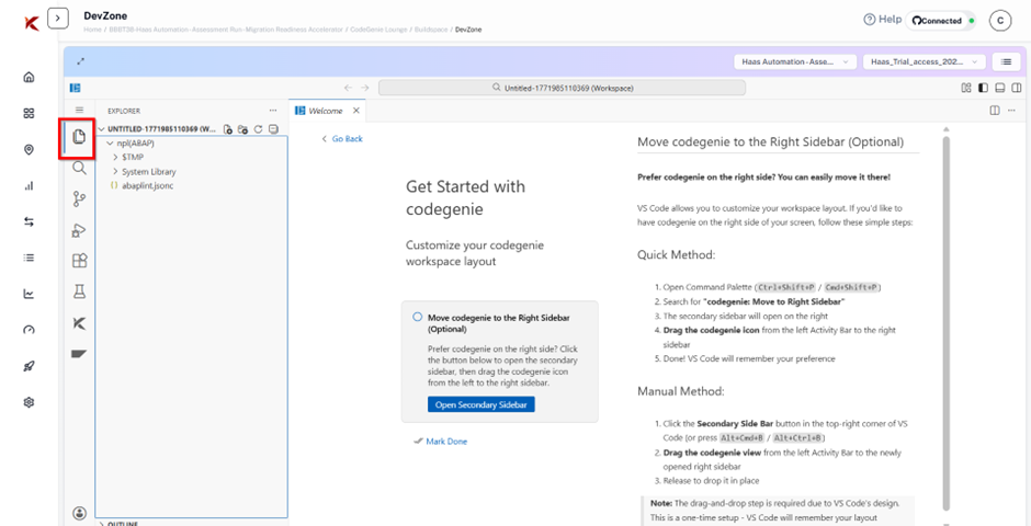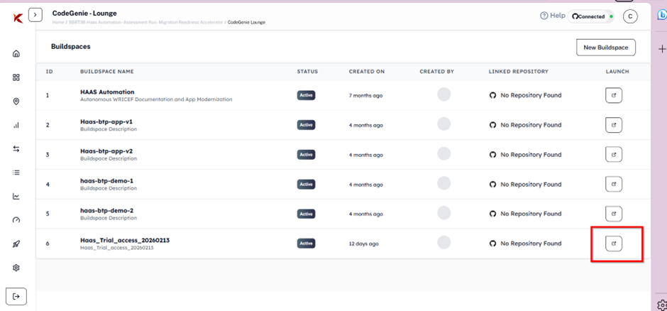 - After login, navigate to Digital Clean Core → KTern.AI CodeGenie to access the Build Space page and you will be able to redirect to the page