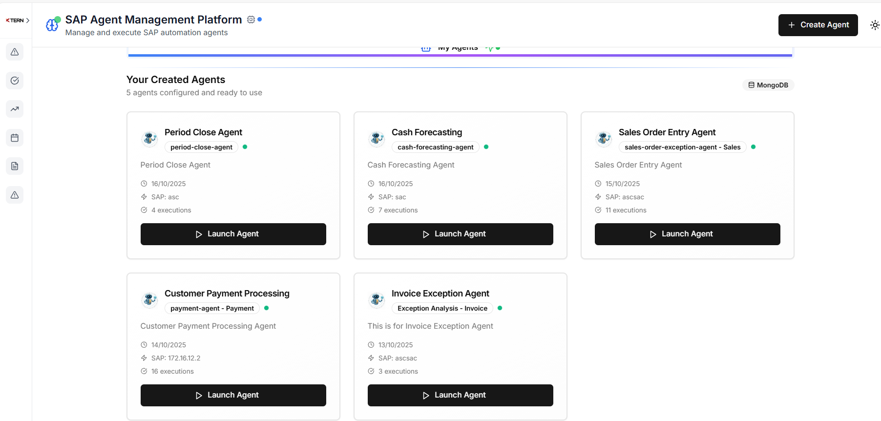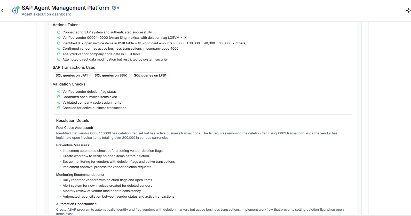 The KTern Exception Handling Agent - an AI-powered autonomous system designed to transform SAP exception management from a reactive, manual task into a proactive, intelligent process. The purpose is to monitor SAP transactions and logs in real time during the execution time to detect potential exceptions or anomalies across SAP Business process modules without human intervention. Once an exception is detected, the agent performs automated root-cause analysis by looking into the SAP ERP landscape and starts processing for the auto remediation by following a workflow process of valuational checks and implementing the fix.