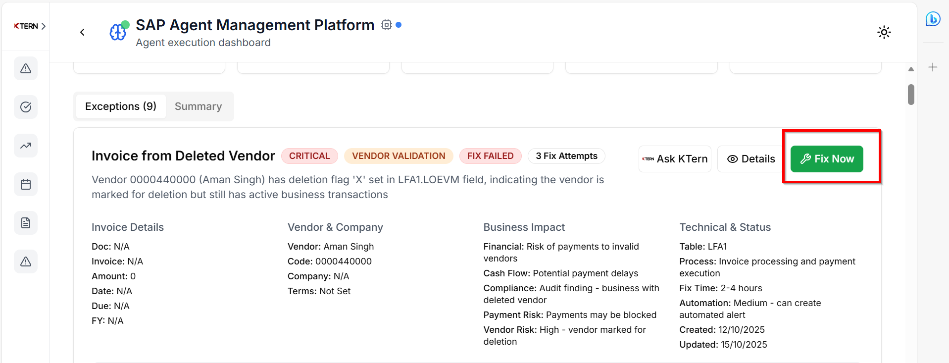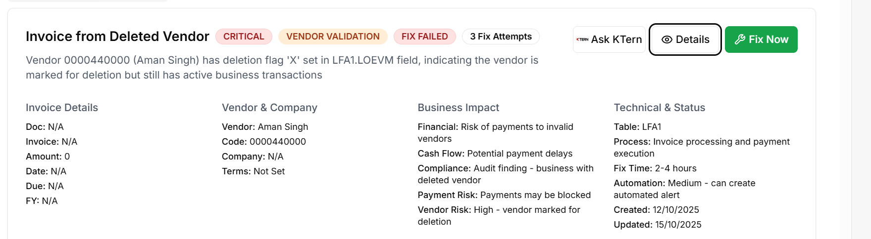 Below is a real-world example of showcasing how KTern.AI accelerates the exception handling process, by reducing the manual efforts from detection to remediation.